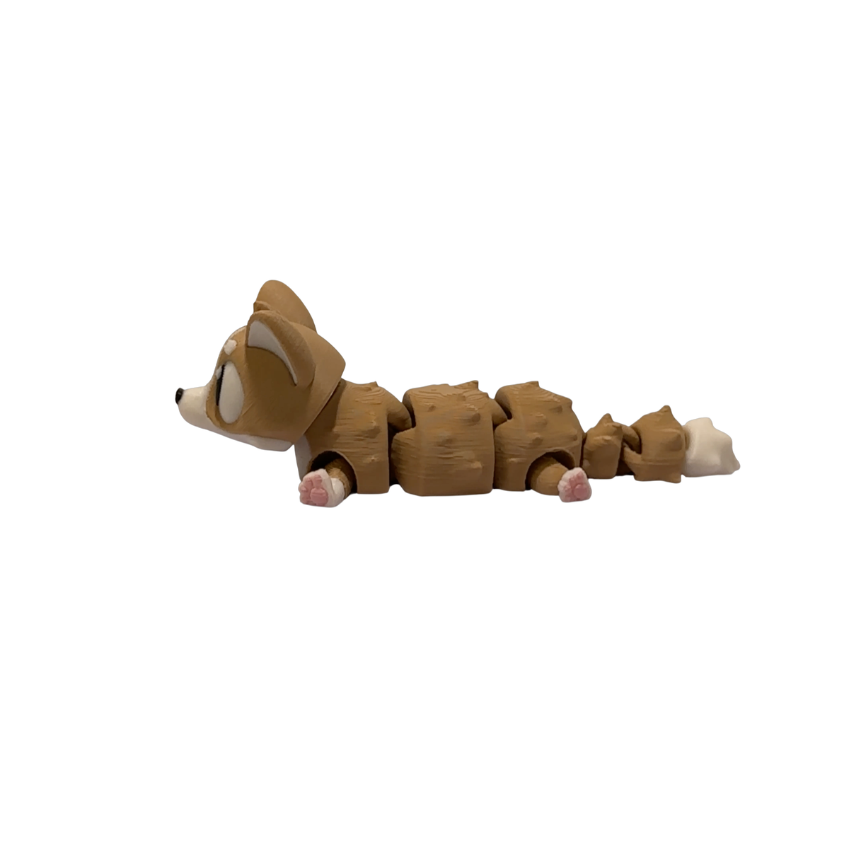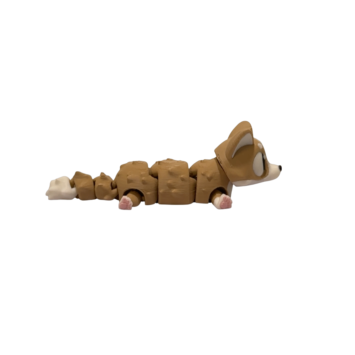 Bring cheerful personality to your space with this 3D printed corgi figurine, a ready-to-ship Flexi Corgi designed by 3DGOB and finished by Layer By Layer Prints. Its articulated segmented body bends and wiggles with a gentle touch, making it a fun corgi desk buddy for desks, shelves, and cozy corners.